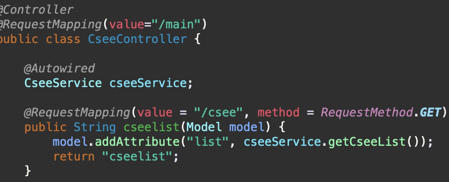 0. 사용자로부터 ../main/csee 로 요청이 들어오면 Dispatcher Servlet를 거쳐 CseeController의 cseelist 함수가 실행된다.